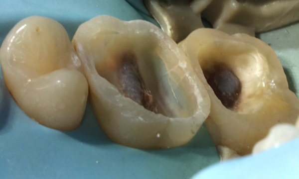 These molars were breaking down due to the decay and cracks that had spread beneath existing composite (tooth coloured) fillings.