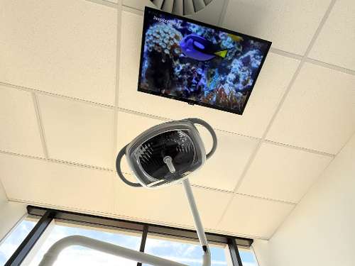 Ceiling-mounted TVs in treatment rooms provide a comfortable distraction during procedures. Patients can choose to watch Youtube, Netflix or Cast from their phones.